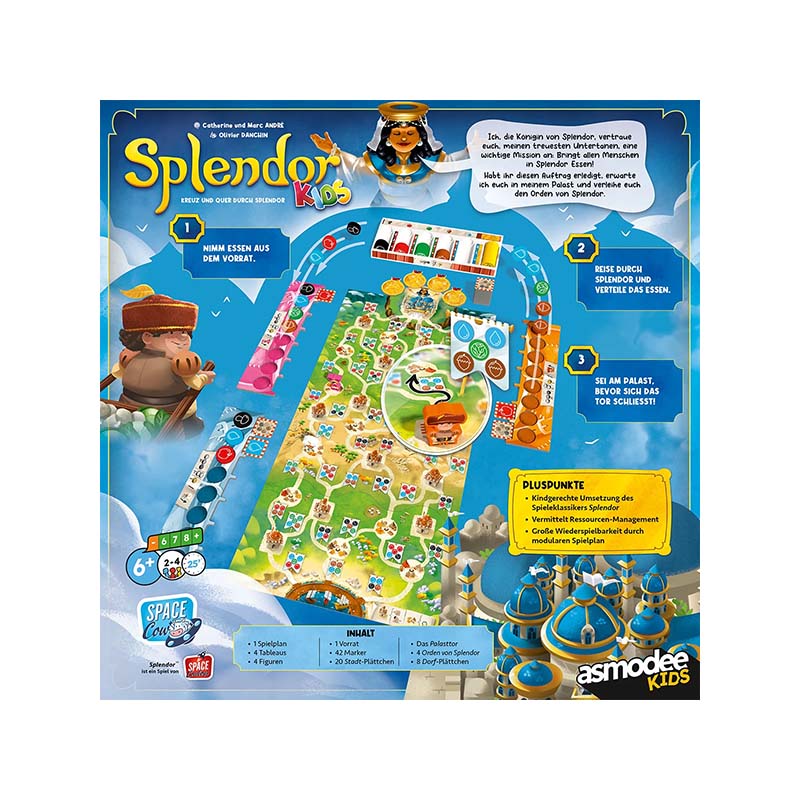 Entdecke das charmante Kinderspiel Splendor Kids – eine kindgerechte Version des beliebten Strategiespiels, bei der Kinder ab 6 Jahren die königliche Mission übernehmen und Nahrung im Königreich Splendor verteilen.