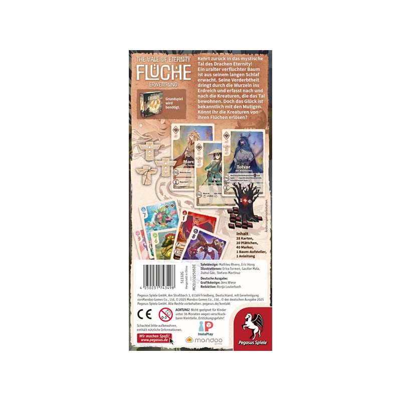 In der Erweiterung The Vale of Eternity: Flüche erwacht ein uralter, verfluchter Baum im Tal von Eternity und breitet seine dunkle Macht über das Land aus. Neue Fluchkarten, Marker, Bändiger‑Plättchen und ein atmosphärischer Baum‑Aufsteller bringen frischen Wind ins Spielgeschehen. Jede Runde stehen die Spieler vor der Entscheidung, ob sie sich den Flüchen stellen oder ihren Einfluss mindern wollen. Die Erweiterung lässt sich ideal mit dem Grundspiel und auch mit dem Modul „Artefakte“ kombinieren. Sie bringt nicht nur neue Mechaniken, sondern auch eine deutlich erhöhte strategische Komplexität – perfekt für alle, die bereits Erfahrung mit dem Grundspiel gesammelt haben und es jetzt noch intensiver erleben möchten. 28 neue Karten 20 Bändiger‑Plättchen 40 Marker 1 Baum‑Aufsteller 1 Spielanleitung Spieleranzahl: 2 bis 4 Spieldauer: ca. 40–60 Minuten Alter: ab 14 Jahren Zum Spielen wird das Grundspiel benötigtInhalt der Erweiterung: