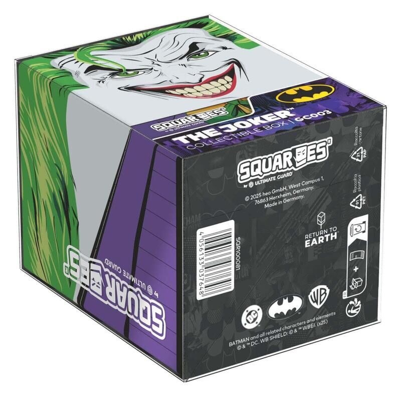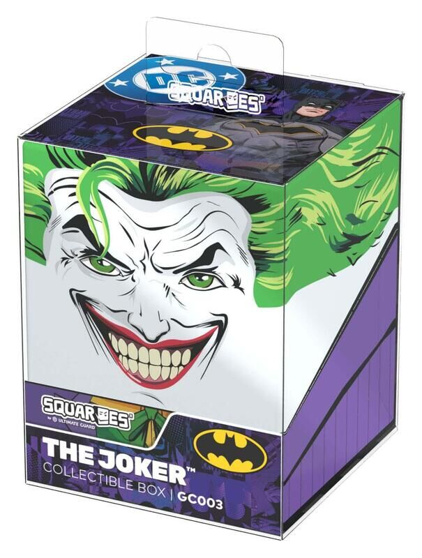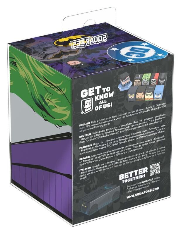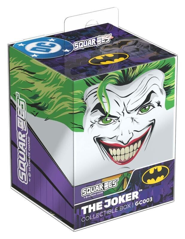 Sammelbare Box zur Aufbewahrung von TCG-Decks, Tabletop-Zubehör und/oder Sammlerstücken. Der Joker Squaroe aus der Batman: Gotham City-Edition bietet als Deck-Box benutzt Platz für bis zu 100 Spielkarten in doppelter Schutzhülle. Squaroes werden aus 78% erneuerbaren Rohstoffen hergestellt und passen perfekt in das separat erhältliche Collectors Case.