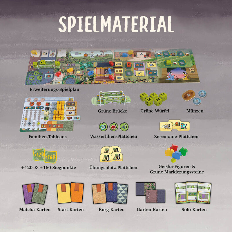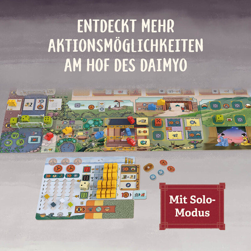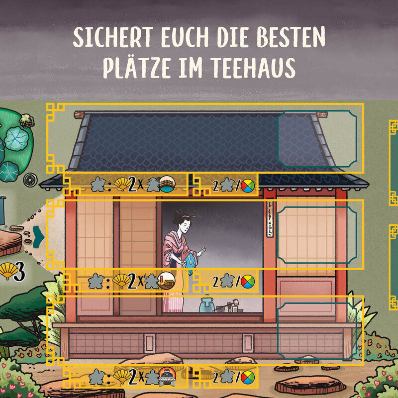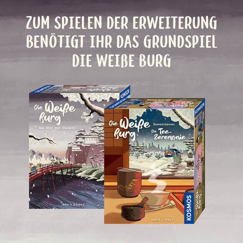 Gastfreundschaft, Respekt, Macht: Die Tee-Zeremonie hat auf Burg Himeji eine wichtige Bedeutung. Um den eigenen Einfluss am Hofe zu vergrößern, suchen sich ein bis vier Spielerinnen und Spieler die besten Plätze im Teehaus. Die Erweiterung zum Kennerspiel „Die Weiße Burg“ bietet neue Aktionsmöglichkeiten. Mit einem ergänzenden Spielplan, einer neuen Brücke und weiteren Würfeln, Zeremonie-Plättchen und Geisha-Figuren aus Holz. Noch mehr Spielspaß mit einem zusätzlichem Spielzug in jeder Spielrunde erleben.