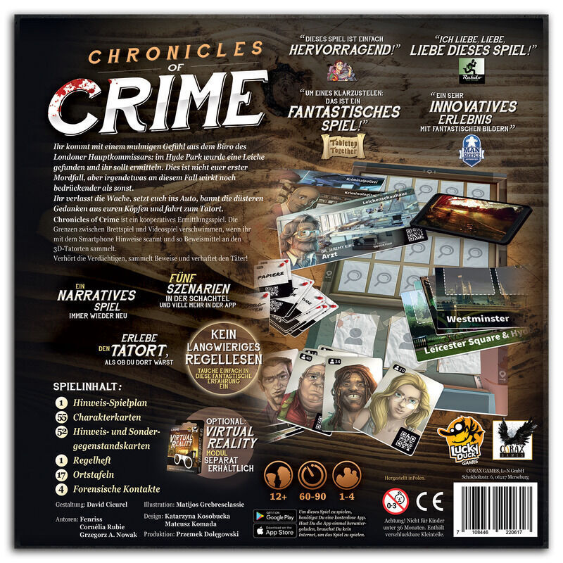 Chronicles of Crime ist ein kooperatives Ermittlungs-Spiel, das Brettspiel, eine App, und optional sogar Virtuelle Realität, miteinander in einer Geschichte verbindet. Du und deine Mitspieler lösen Kriminalfälle, indem ihr in der gesamten Stadt nach Verdächtigen, Zeugen und Hinweisen sucht. Nach den Hinweisen haltet ihr dabei in 3D-Szenen Ausschau!