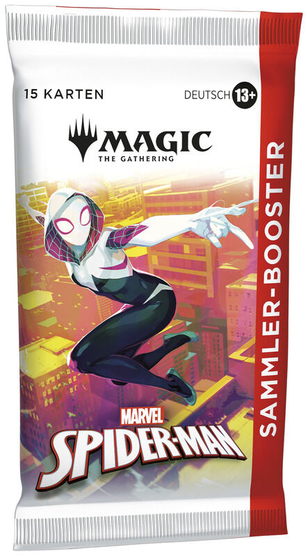 Jeder Booster enthält seltene und/oder sagenhaft seltene Karten, Traditionelle Foilkarten, ein Standardland ohne Rand und mehr. Netzschleudernde Held*innen treffen vielleicht sogar auf noch mehr wunderschöne Foilkarten und bildhübsche Länder.