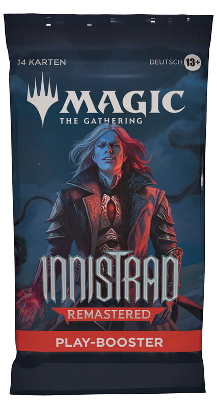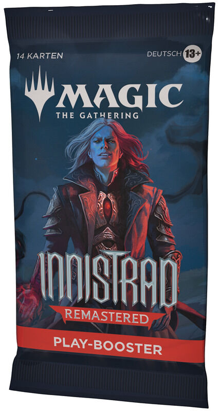 Dieser Innistrad Remastered Play-Booster enthält 14 Magic: The Gathering Karten und 1 Spielstein-/Werbekarte, Hilfekarte oder Artwork-Karte, darunter eine Kombination aus 1–4 Karten der Seltenheit selten oder höher, 3–6 nicht ganz so häufigen Karten, 6–9 häufigen Karten und 1 Länderkarte.