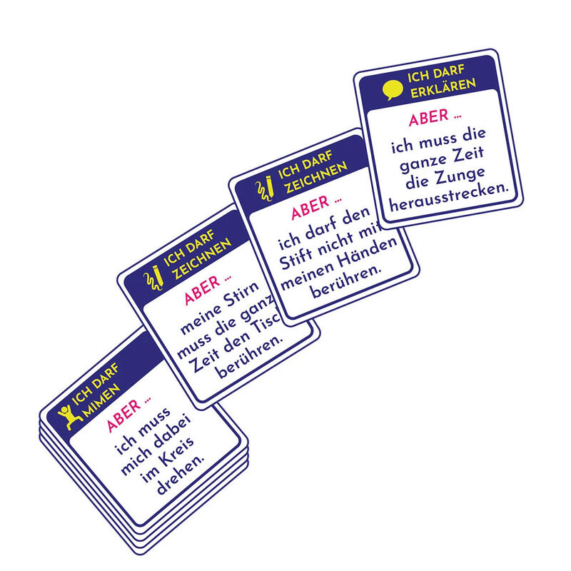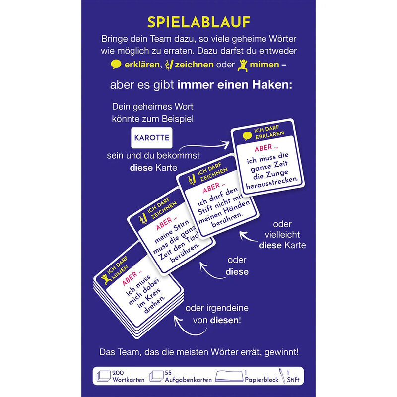 In jeder Runde gibt eine Person Hinweise. Dabei muss sie eine Reihe von Regeln befolgen und es gibt immer einen Haken, der das Ganze noch etwas schwieriger macht. Habt ihr schon mal versucht, das Wort „Karotte“ zu erklären, aber dabei die ganze Zeit die Zunge herauszustrecken? Oder das Wort „Fernbedienung“ zu zeichnen, aber dabei muss eure Stirn die ganze Zeit die Tischplatte berühren?