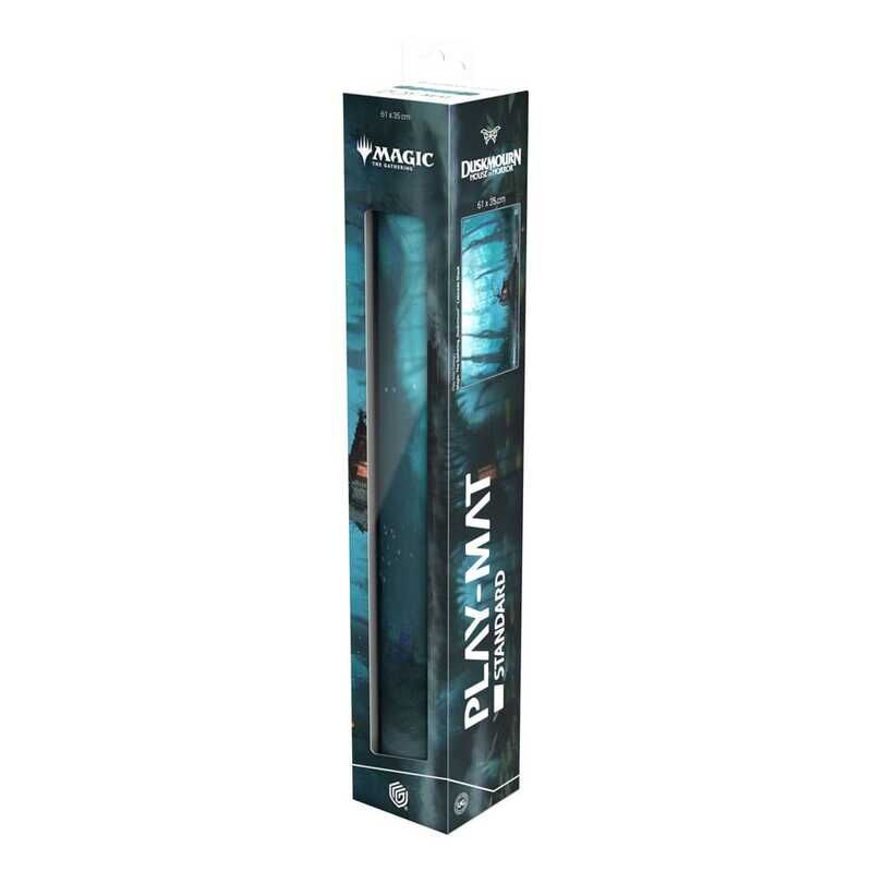 Die 61x35cm große Play-Mat schützt Karten und Hüllen beim Spielen und verbessert das Spielerlebnis dank ihrer rutschfesten Unterseite, während die vernähten Kanten eine noch längere Lebensdauer garantieren. Die Oberseite der Play-Mat ist mit offiziell lizenzierten Artworks aus dem kommenden Magic: The Gathering Set „Duskmourn“ bedruckt.