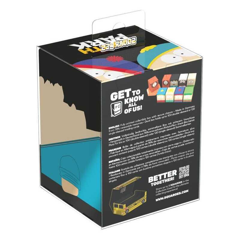 Sammelbare Box zur Aufbewahrung von TCG-Decks, Tabletop-Zubehör und/oder Sammlerstücken. Der Stan Squaroe aus der South Park™-Edition bietet als Deck-Box benutzt Platz für bis zu 100 Spielkarten in doppelter Schutzhülle. Squaroes werden aus 78% erneuerbaren Rohstoffen hergestellt und passen perfekt in das separat erhältliche Collectors Case.