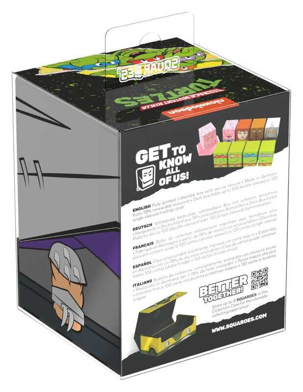 Die perfekte Aufbewahrungsbox für mehrere TCG-Decks, Sammelkarten und natürlich deine Squaroes-Sammlung: Das „Turtle Van“ Collectors Case aus der Teenage Mutant Ninja Turtles™ Edition ist das ideale Zuhause für bis zu acht Squaroes-Boxen, einzelne Sammelkarten (bis zu 1000 in doppelten Schutzhüllen) oder Spielzubehör aller Art. Das vollfarbig bedruckte, strapazierfähige Xenoskin-Material und der starke Magnetverschluss mit ZnapClaw-Mechanismus sorgen dafür, dass alle Inhalte sicher aufbewahrt werden.