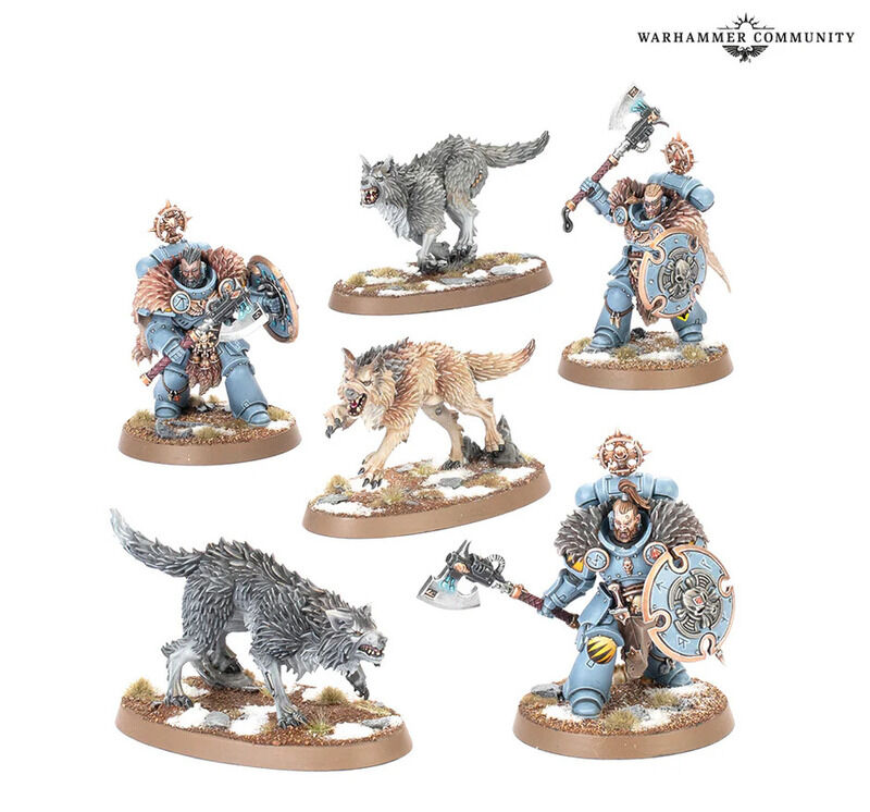 Mehrere Miniaturen – oft inklusive Primaris Space Marines in Space Wolves-spezifischen Varianten (z. B. Intercessors, Assault Intercessors, Bladeguard Veterans, ein Captain oder Lieutenant)