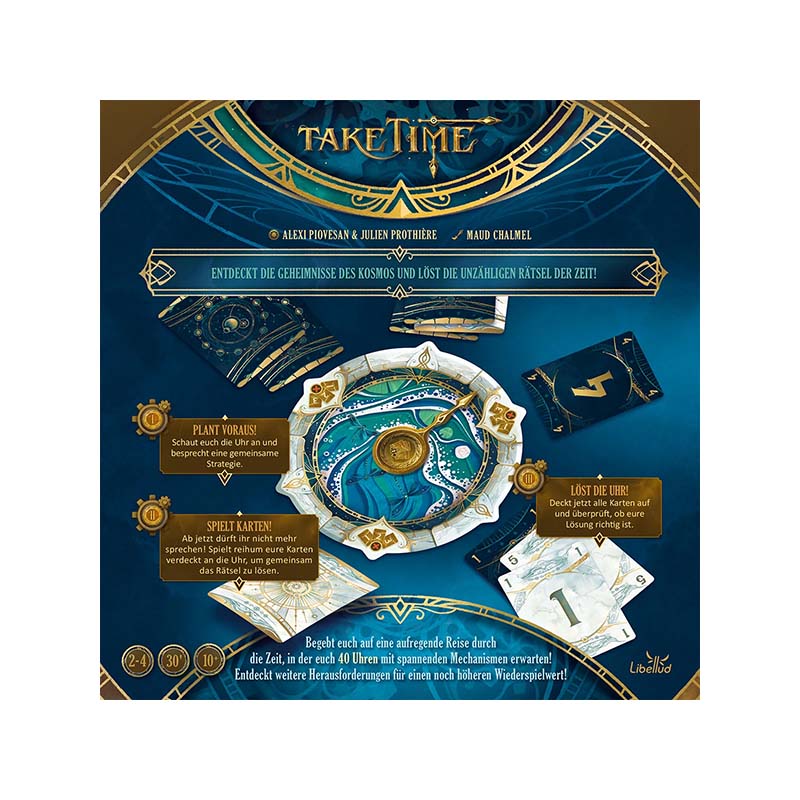 In Take Time arbeiten 2 bis 4 Spieler zusammen, um insgesamt 40 anspruchsvolle Rätsel rund um eine Uhr zu meistern. Ohne miteinander zu sprechen, müsst ihr Karten richtig platzieren, um ein vorgegebenes Ziel zu erreichen. Jede Runde bringt neue Herausforderungen mit sich - von einfachen Aufgaben bis hin zu komplexen Kombinationen aus Sonnen- und Mondkarten. Das Spiel entwickelt sich mit jedem Kapitel weiter und stellt eure Fähigkeit zur nonverbalen Abstimmung immer wieder auf die Probe.