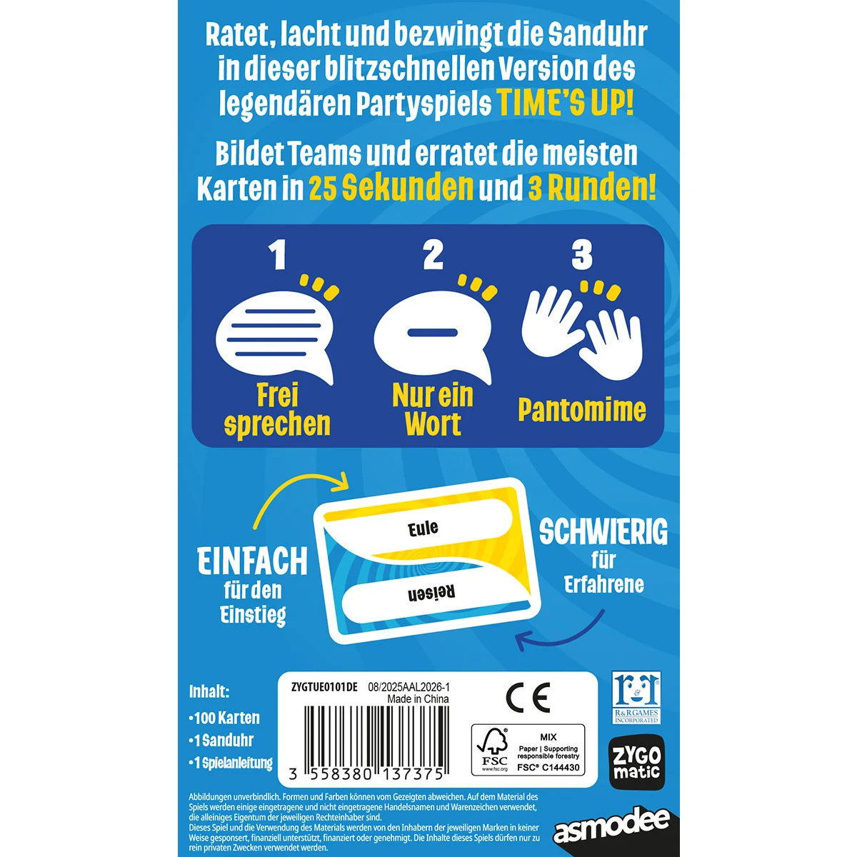Time’s Up! Express (DE) liefert blitzschnellen Ratespaß für zwischendurch. In Time’s Up! Express (DE) versuchen Teams, Begriffe zu erraten – mal mit Worten, mal nur durch Gestik. Das sorgt für spontane Lacher, kreative Momente und jede Menge Dynamik in jeder Runde.