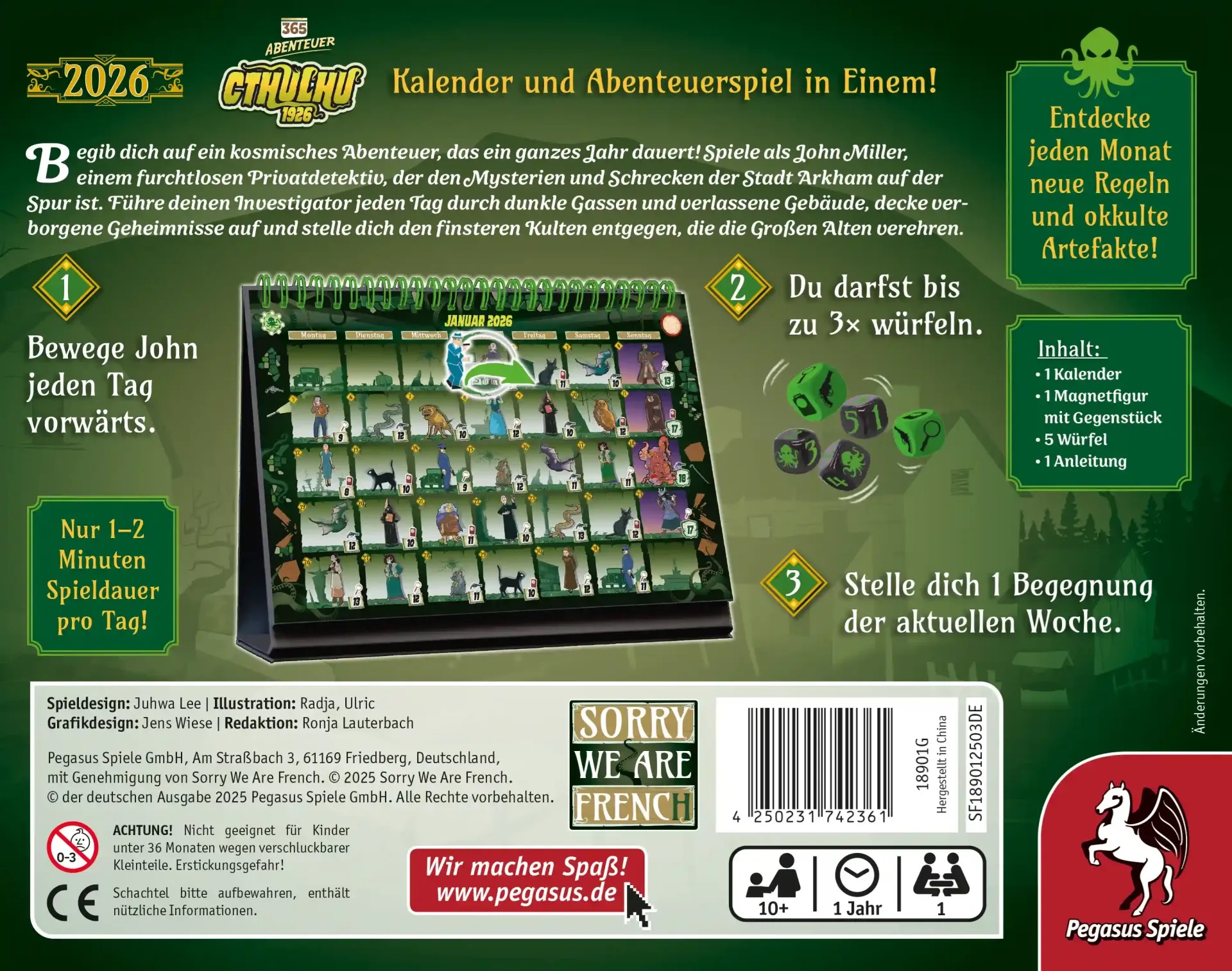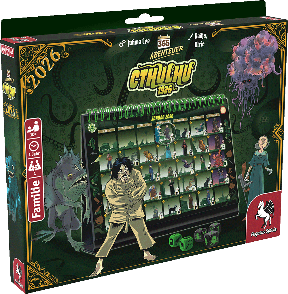 Dunkle Mächte erwachen in 365 Abenteuer – Cthulhu 1926 (Edition 2026)! Schlüpfe in die Rolle des Ermittlers John Miller und stelle dich über 365 Tage hinweg den Schrecken des Mythos. In diesem atmosphärischen Solo-Spiel erforschst du die düsteren Gassen Arkhams, deckst Kult-Geheimnisse auf und bewahrst dein eigenes mentales Gleichgewicht – oder verfällst dem Wahnsinn.