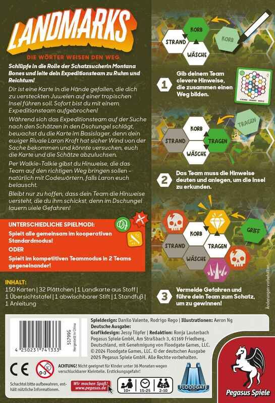 In dem assoziativen Wortspiel Landmarks begeben sich die Spielenden gemeinsam als Expeditionsteam auf die gefährliche Suche nach Juwelen. Um sich den Weg durch den Dschungel zu bahnen, sind sie auf die Hilfe von Montana Bones angewiesen, die ihnen per Walkie-Talkie Hinweise durchgibt. Zu Beginn jeder Partie startet das Expeditionsteam mit drei Wortplättchen, an denen sie im Verlauf des Spiels weiter anlegen müssen. Eine Person, die Montana Bones verkörpert, beschriftet in jeder Runde ein neues Wortplättchen mit einem verschlüsselten Hinweis. Es ist dann Aufgabe des Teams herauszufinden, an welcher Stelle das Plättchen angelegt werden muss. Legt das Team ein Plättchen falsch an, könnten sie in eine Falle tappen, die sie wichtige Wortplättchen kostet, oder einen tödlichen Fluch auslösen. Die Mission ist nur dann gewonnen, wenn es dem Team gelingt, mit mindestens einem Juwel ins Camp zurückzukehren, bevor ihnen das Wasser ausgeht.