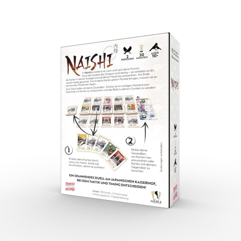 Naishi vereint Elemente aus Hand-Management, Set-Collection und Wettbewerb um Kartenpositionen. Bei guter Planung, vorausschauendem Einsatz der Gesandten und cleverem Positionieren ließe sich ein knapper Wettkampf entschärfen und gewinnen.