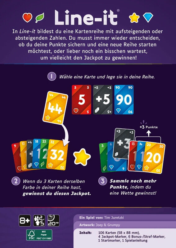 Ziel des kurzweiligen Kartenspiels Line-it ist es, eine aufsteigende oder absteigende Reihe von Zahlenkarten zu bilden, um Punkte zu erzielen. Dabei geht es darum, im richtigen Moment abzuwägen, die eigenen Punkte durch den Beginn einer neuen Reihe zu sichern, oder etwas länger zu warten, um den Jackpot zu knacken! Wettkarten bringen eine zusätzliche Prise Nervenkitzel ins Spiel während die kurze Spieldauer und farbenfrohe Optik direkt zu einer weiteren Partie einladen.