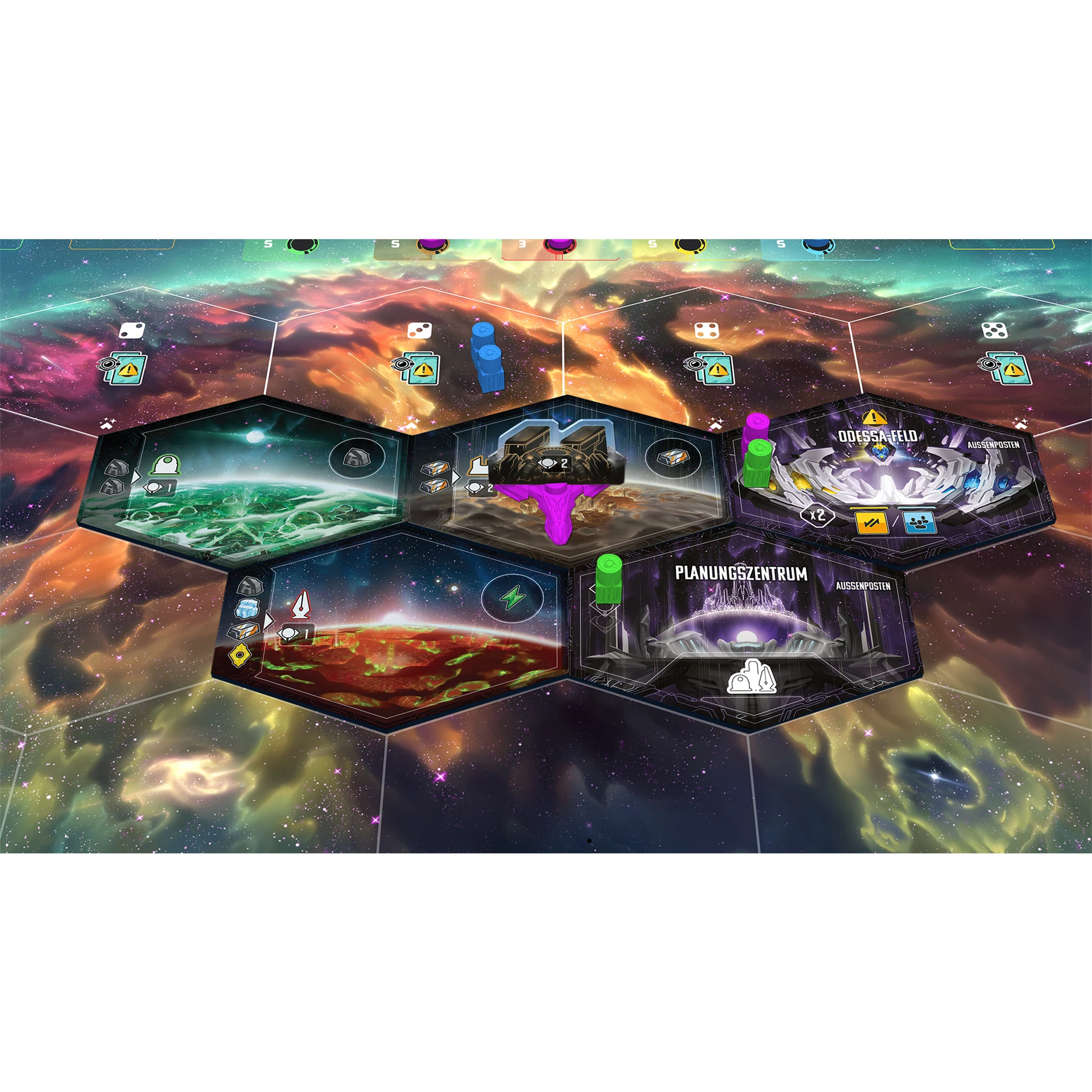 Modularer Spielplan: Nebelwolken, Raumsektoren, Schrottplatz und Eventbereiche schaffen jedes Mal neue Herausforderungen