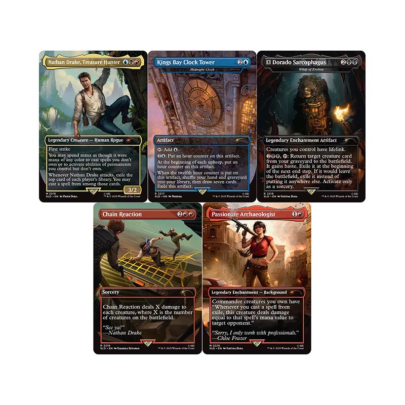 • Thematisch gestaltete Magic‑Karten im Secret Lair‑Design mit Uncharted-Motiven.