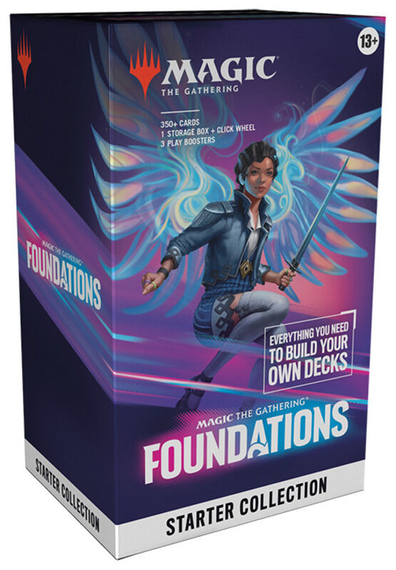 Jede Foundations-Einsteigersammlung enthält 26 traditionelle Foilkarten, 361 normale Karten (einschließlich 90 Länder, davon 10 mit großflächiger Illustration), 3 Play-Booster (mit je 14 Karten), 13 doppelseitige Spielsteinkarten, 1 Deckbau-Leitfaden, 2 Referenzkarten, 1 Klickrad-Lebenspunktezähler und 1 Kartenaufbewahrungsschachtel.