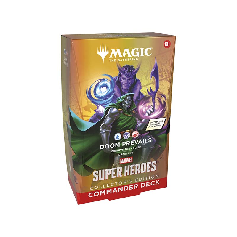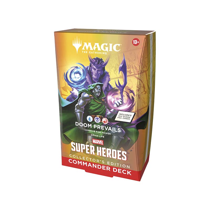 Das Magic: The Gathering Marvel Super Heroes Collector’s Edition Commander Deck Doom Prevails ist ein Premium-Commander-Deck aus der Marvel Super Heroes-Edition in englischer Sprache und richtet sich an Sammler:innen sowie Spieler:innen, die ein besonders hochwertiges Spielerlebnis suchen. In der Collector’s Edition sind alle Karten in edler Surge-Foil-Ausführung enthalten und bringen die düstere Macht von Doctor Doom eindrucksvoll zur Geltung.