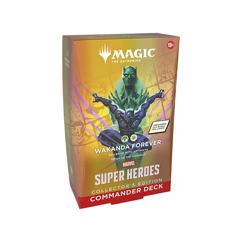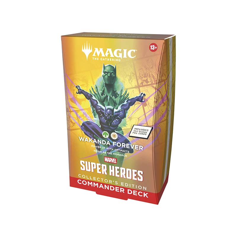 Dieses Marvel Super Heroes Collector’s Edition Commander Deck Wakanda Forever ist ein Premium‑Commander‑Deck aus der Magic: The Gathering Marvel Super Heroes‑Edition in englischer Sprache. Es gehört zur exklusiven Collector’s Edition‑Reihe, bei der alle Karten als hochwertige Surge‑Foil‑Varianten gedruckt sind – ideal für Sammler:innen, Commander‑Fans und alle, die das Marvel‑Universum besonders stilvoll im beliebtesten Multiplayer‑Format erleben möchten.