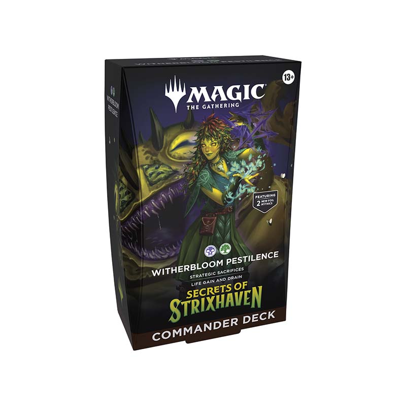 Das Secrets of Strixhaven Commander Deck Witherbloom Pestilence ist ein spielfertiges Commander‑Deck aus der Magic: The Gathering‑Edition Secrets of Strixhaven in englischer Sprache. Es gehört zu den fünf neuen 100‑Karten‑Decks, die jeweils ein College der legendären Magier‑Universität Strixhaven repräsentieren und sich ideal für das beliebte Multiplayer‑Format Commander eignen.